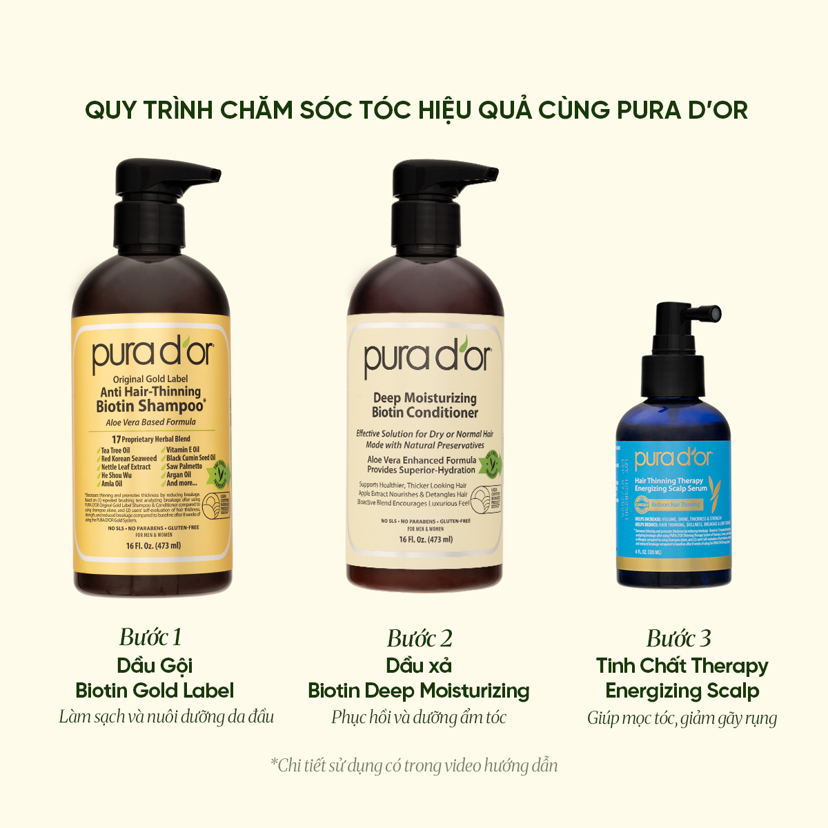 Combo 3 Bước Dầu Gội, Dầu Xả, Giảm Rụng Tóc Organic Pura D'or Biotin Gold Label 473ML | Chăm Sóc Tóc, Chăm Sóc Da Đầu, Dưỡng Tóc, Hỗ Trợ Mọc Tóc - Mega Livestream - Combo 3 bước 473ml